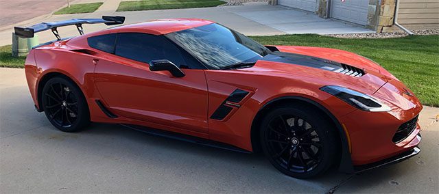I really loved the Sebring Orange color when it appeared in 2018. I found a brand new 2018 Sebring Orange Grand Sport at our local Chevrolet Dealer and I was going to trade in my 2017 Watkins Glenn Gray Stingray on the Grand Sport. Unfortunately, one of the salesmen took the 2018 out on a test ride, had turned the traction control off, lost control, and totaled it out hitting the overhead bridge support on South I29 interstate here in Sioux Falls ! Found my 2019 Sebring Orange Grand Sport at another Dealer in South Dakota, and at the time just loved the High ZTK wing on the 2019 ZR-1, so just had to do it. Mine is special as I ordered it Carbon Flash black instead of Carbon Fiber black. Just completed it real late this Summer but boy do I get the looks! Thanks! Wayne H. |